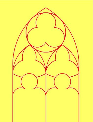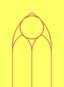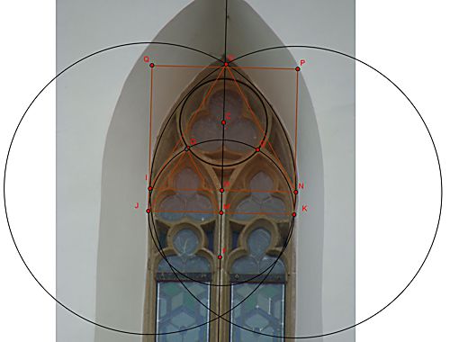 ![]() | Po wstępnej korekcji zniekształceń trapezowych trzeciego zdjęcia dokonałem analizy geometrycznej. Ostrołuk główny, jak i ostrołuki wewnętrzne są zbudowane na bazie trójkąta równobocznego. Jednak podstawy ostrołuków wewnętrznych są nieco obniżone w stosunku do podstawy ostrołuku głównego. |