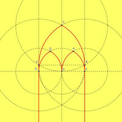 | Rysuję odcinek AB (szerokość okna – podstawa ostrołuku). Konstruuję okręgi o środku A oraz B i promieniu AB. Wyznaczam punkt C. Konstruuję prostopadłą do AB przechodzącą przez C. Z analizy geometrycznej wynikało, że podstawy wewnętrznych ostrołuków znajdują się od wierzchołka C w odległości równej szerokości okna. Zakreślam więc okrąg o środku C i promieniu AC. Znajduję punkt D. Konstruuję prostopadłą do CD przechodzącą przez D i kolejno prostopadłe do powstałej prostej przechodzące przez A i drugą przez B. Odcinki ED i EF są podstawami wewnętrznych ostrołuków. Następnie rysuję okręgi o środkach E, D i F i promieniu ED znajdując punkty G i H – wierzchołki wewnętrznych ostrołuków. Koloruję odpowiednie łuki. |
