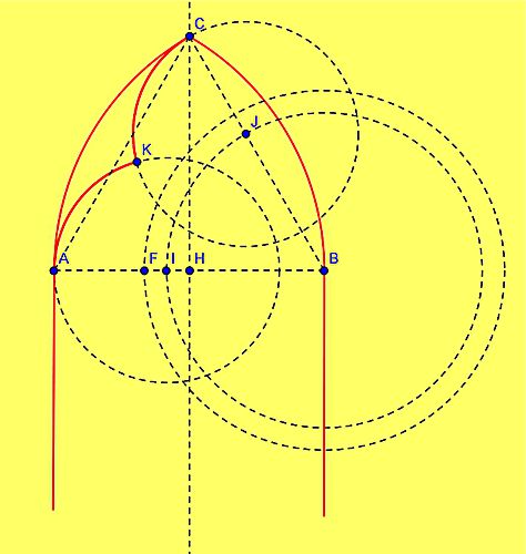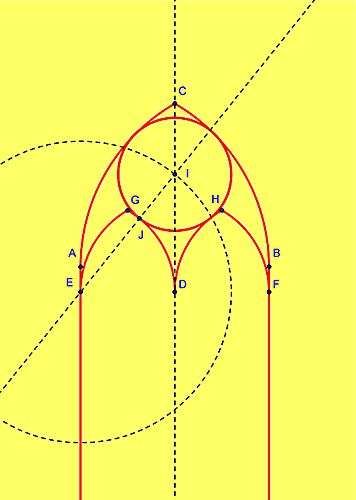| ![]() Muszę teraz podzielić odcinek EF na 10 części i narysować okrąg o środku E i promieniu 0,8 EF. Można ten podział zrobić konstrukcyjnie, ale ja posłużę się poleceniem: Okrąg[E,0.8*EF]. Znajduję punkt I, który jest środkiem szukanego okręgu. Konstruuję prosta EI znajdując punk styczności J z małym ostrołukiem i rysuję okrąg o środku I i promieniu IJ. Po usunięciu linii pomocniczych i dorysowaniu środkowego ramienia okna otrzymałem taki maswerk. |