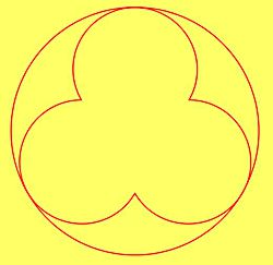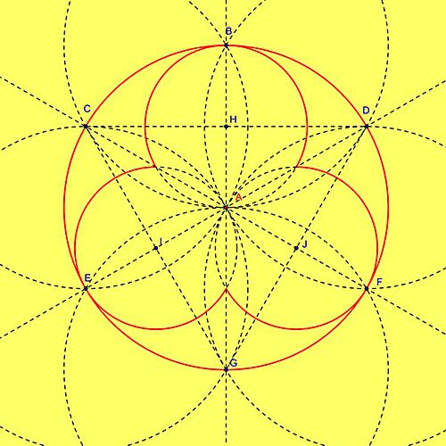 ![]() | ![]() Mam dany okrąg o środku A. Na okręgu zaznaczam punkt B i dzielę okrąg na 6 równych części (rysuję okrąg o środku B i promieniu AB; otrzymuję punkty C i D, które są środkami kolejnych okręgów itd.; otrzymuję punkty E, F oraz G). Rysuję trójkąt CDG oraz proste BA, CA i DA. Punkty H, I, J tworzą środki okręgów tworzących trójliść. Koloruję właściwe łuki. |