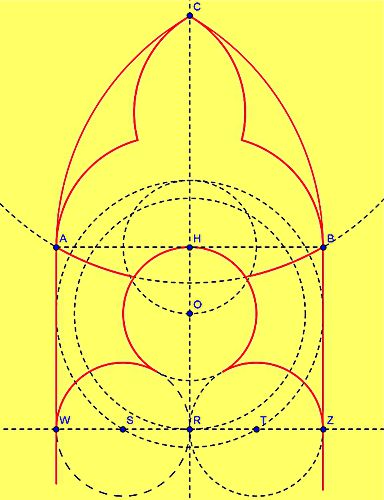 ![]() | Zajmę się teraz najniżej położonymi ozdobami w wewnętrznych ostrołukach. Składa się on z jednego prawie okręgu oraz dwóch ćwierćłuków. Wszystkie elementy są zbudowane na okręgach o promieniu ¼ szerokości okna. Wszystko u góry zwieńczone jest jeszcze łukiem. Z punktu H kreślę okrąg o promieniu ¼ AB. Znajduję punkt O, który jest środkiem okręgu o promieniu OH. Rysuję okrąg o środku C i promieniu AB. Punkt O oraz środki ćwierćłuków S i T tworzą trójkąt równoboczny o boku ½ AB. Aby znaleźć te punkty wystarczy zakreślić okrąg o środku O i promieniu równym wysokości trójkąta OST. Skorzystam z polecenia okrąg[O,sqrt(3)/4*AB]. Znajduję punkt R i konstruuję prostopadłą do prostej HO i przechodzącą przez R. Aby znaleźć punkty S i T rysuję okrąg o środku O i promieniu ½ AB. Z punktów S i T zakreślam okręgi i koloruję odpowiednie łuki. |